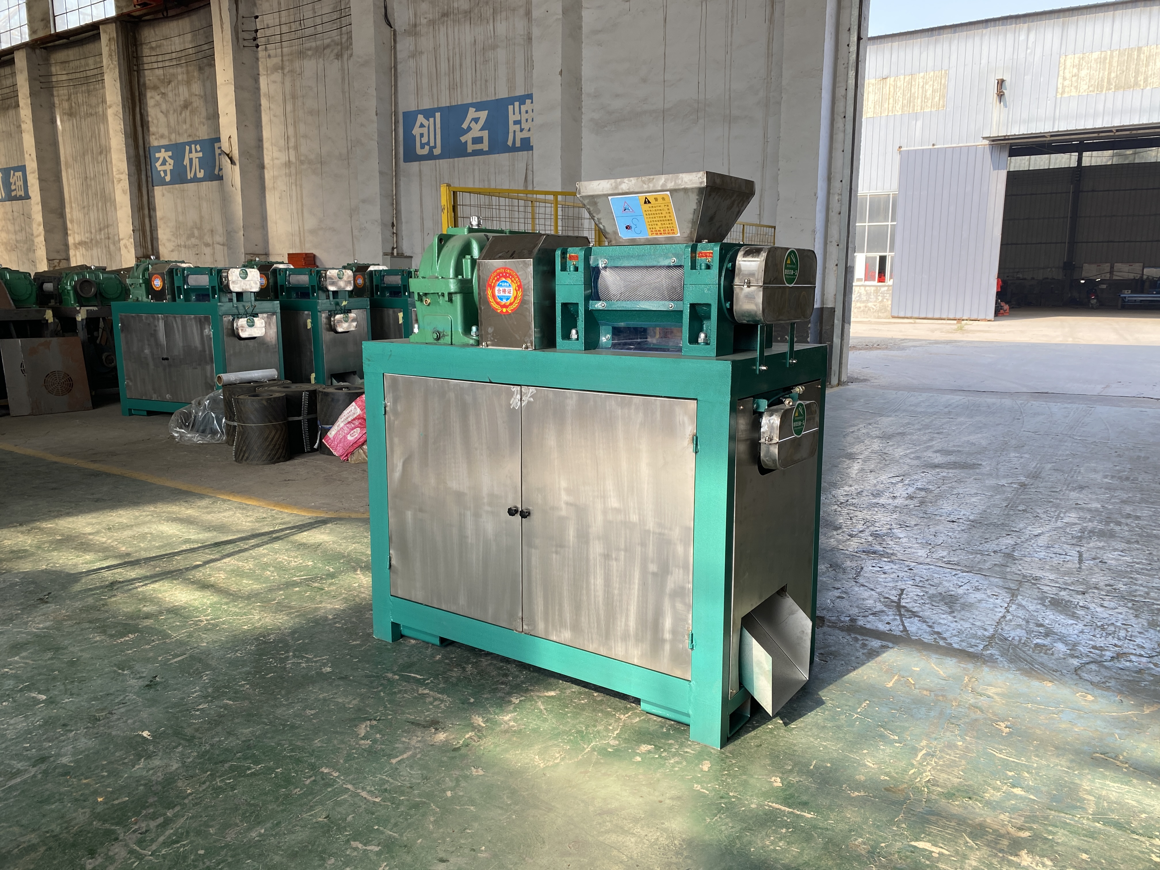 解决上述痛点的关键,就在于——对辊挤压造粒机。它堪称有机肥生产的“成型大师”,其原理是通过两个高强度、带有多排模孔的辊筒,对干燥的粉状物料进行高压挤压。物料在巨大的压力下相互啮合,被强制压入辊筒的球窝内,直接形成大小均匀、强度高的球形颗粒。