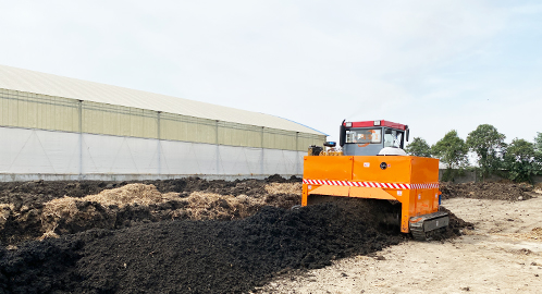 履带式翻堆机属大型翻抛机的一种,全液压操作系统,拉杆式方向盘操作,履带式行走,结实耐用,动力强劲,产量大、翻抛能力强,翻抛滚筒液压升降调节,自动化程度高,操作简单易掌握。是有机物料耗氧发酵转化成有机肥的专业翻抛设备。 履带式翻堆机 生物有机肥翻抛机是把蓄禽粪便、农业废弃物、糖厂滤泥、污泥、生活垃圾等污染物,通过耗氧发酵的原理制成绿色环保、改善土质的生物有机肥。可达到一天升温、3-5天除臭、灭菌(能杀灭粪便中的虫卵病菌等)、七天成肥,比使用其它机械手段发酵方法速度快,效率高。根据客户要求也可增加一些辅助设施,如自动洒菌装置等。 地面堆放发酵模式是目前节省土建、人力资源的一种制肥模式。需将物料堆成长形条垛,由翻堆机定时对物料实施搅拌、破碎,在好氧条件下进行有机物的分解。兼有破碎的功能,大大节省了时间和劳力,使有机肥厂生产效率和产品质量有显著提高,成本大大降低。翻堆机工作时可以很有效地把污泥、粘稠鸡粪等物料与菌种、秸秆粉搅拌均匀。为物料发酵创造了更好的好氧环境。不仅比深槽发酵速度快的多,还有效防止了发酵过程中硫化氢、胺气、吲哚等有害、恶臭气体的产生,符合环保要求。